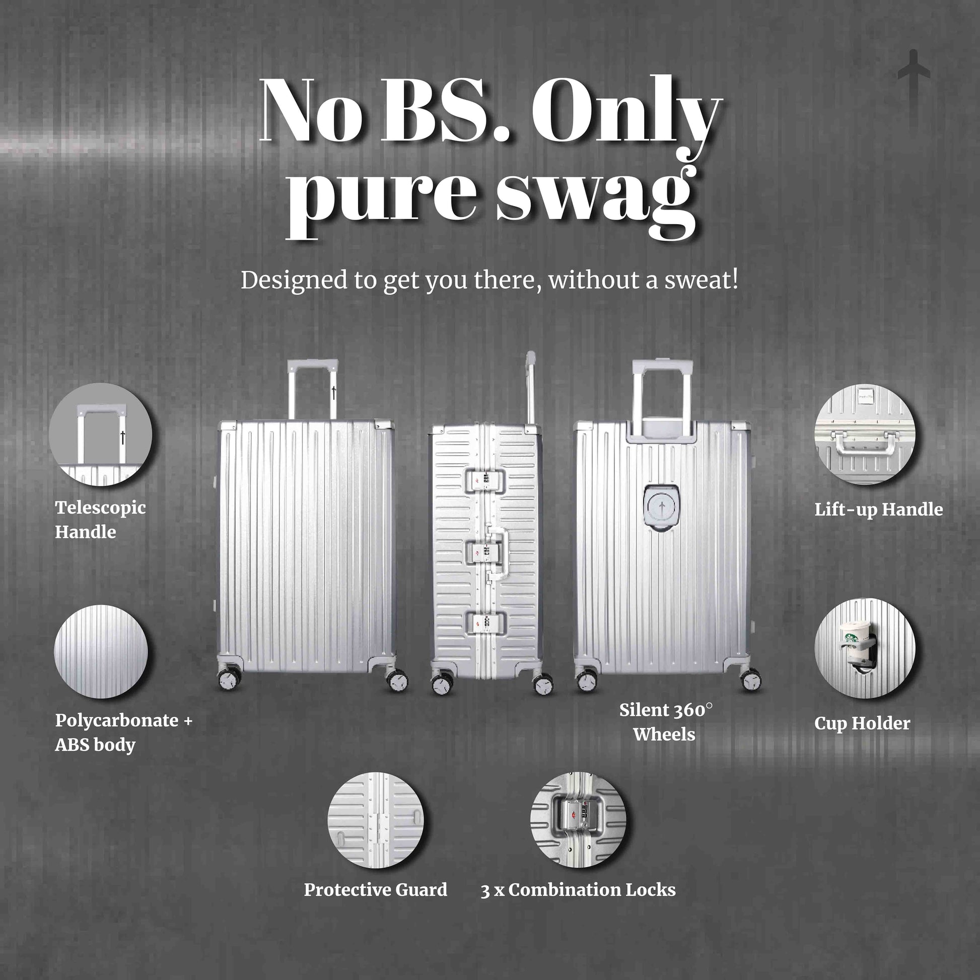 Crafted from a blend of high-performance Polycarbonate and ABS, BIG BOY AL owns the brushed-metallic look of aluminium. With reinforced edges, clean vertical ridges and matte silver - this suitcase is fashioned to impress.