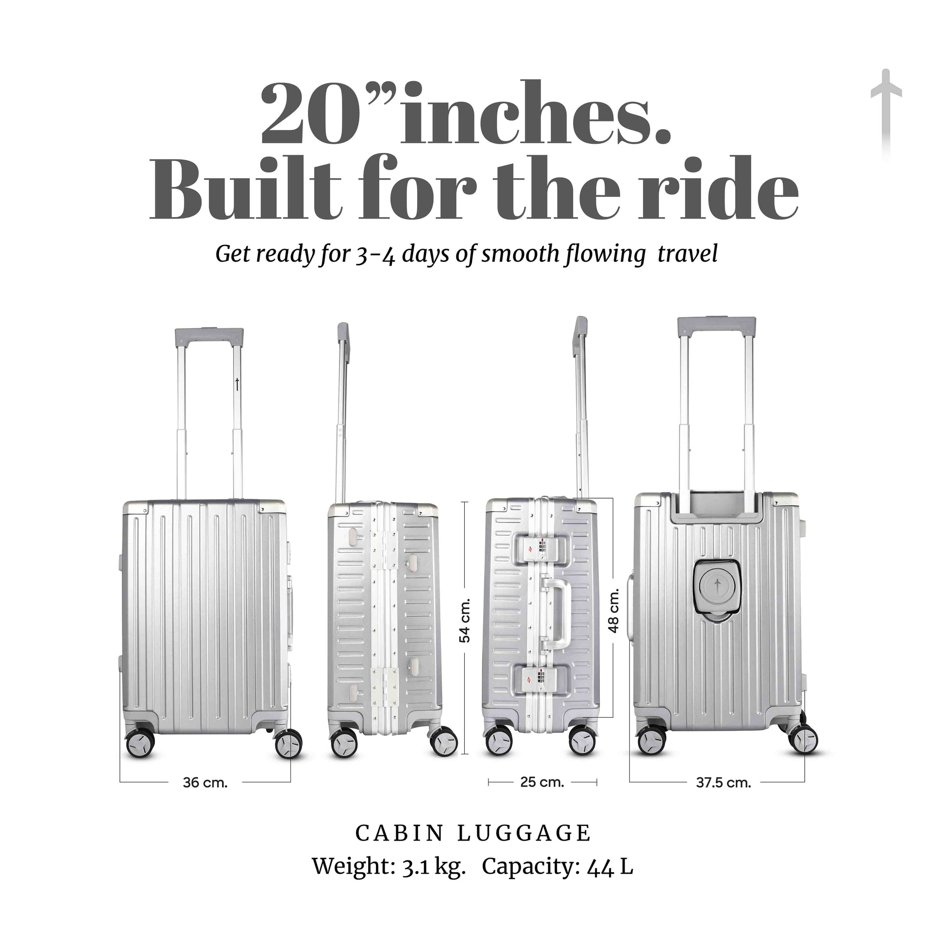 The interior compression straps snap tightly to keep things in place. A set of two combination locks secure your belongings. Rugged corner guards absorb shocks and resist scuffs at high-impact zones. AL doesn’t take well to losing its shine!